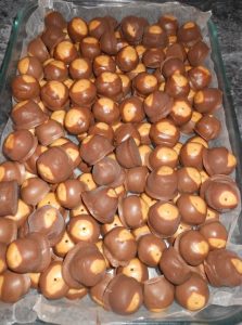 Buckeye Style: Leave a small portion of peanut butter exposed on top.